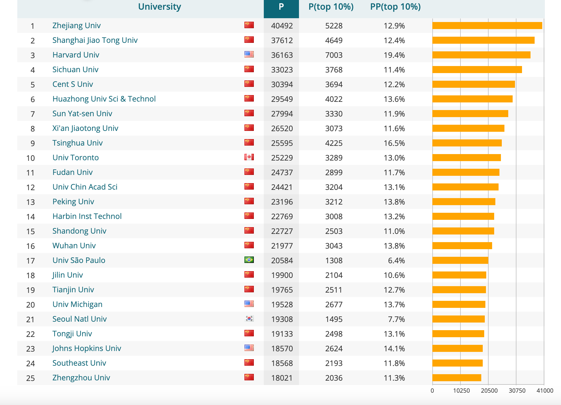 Na edição mais recente do Ranking de Leiden, divulgada em 2025, o domínio chinês é evidente — a começar pelo primeiro lugar, ocupado pela Universidade de Zhejiang.