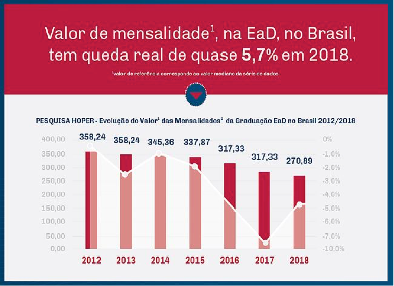 De fato, a discrepância entre uma modalidade e outra é grande. Uma pesquisa , divulgada recentemente pela Hoper Educação, mostrou que o valor médio da mensalidade EAD teve queda de 5,7% em 2018, chegando a R$ 270,89. Já a mensalidade dos cursos presenciais, embora apresente queda real nos últimos três anos, custa quase o triplo: R$ 796.
